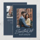 Esta elegante invitación de "guarda la fecha" presenta un texto con estilo retro "guarda la fecha" debajo de una sola foto sobre un fondo clásico azul marino junto con un texto personalizado simple. La parte posterior de esta moderna invitación de "guarda la fecha" tiene una franja azul coordinada junto con una foto horizontal, espacio para un mensaje personalizado y un código QR para el sitio web de la boda. Este diseño vertical es ideal para una pareja moderna y elegante y es una excelente manera para que la pareja comprometida comparta información sobre la boda con amigos y familiares. Encuentre más colores y estilos en la colección de Lea Delaveris Design. También disponible como descarga digital de "guarda la fecha".