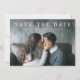 Estas tarjetas de aviso de boda sencillas y elegantes presentan su foto a sangre, junto con un texto serif blanco clásico y un dorso gris suave.