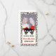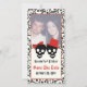 Elegantes cráneos boda negra de Halloween rojo Guardar la tarjeta de foto de la fecha, con una pareja de cráneos negros novia y novio sobre fondo de marfil y un borde de patrón de cráneo. El novio lleva un gorra rojo y la novia un arco rojo.