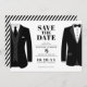 Haga saber a todos que ustedes dos han fijado una fecha para su boda con esta tarjeta moderna de guardar la fecha con dos trajes negros. Personalice agregando sus nombres, fecha y ubicación de la boda.