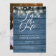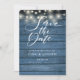 Este rústico salva la tarjeta de fecha con luces de cuerda y un guión elegante ahorra la fecha por encima de tus detalles en una tipografía elegante sobre un fondo rústico de paneles de madera azul y tu foto especial al revés. Diseñado por Thisisnotme©