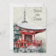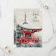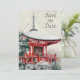 La invitación Save the Date de esta boda captura la belleza oriental de Japón. Tiene un bonito fondo natural con un templo budista japonés pintado y vegetación.