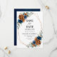 Elegante tarjeta de aviso de boda con tema floral de tierra naranja azul marino, terracota, con elegante ramo de rosas de color azul marino, peonías de color terracota y hojas de eucalipto verdes. Por favor, contácteme para cualquier ayuda en personalización o si necesita algún otro producto con este diseño.