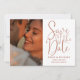 Esta elegante boda de escritura de terracota ahorra la invitación de fecha puede ser personalizada con sus 2 fotos especiales e información del día de la boda y el código QR del sitio web boda. Diseñado por Thisisnotme©
