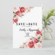 This save-the-date card sets a sophisticated tone for your upcoming wedding. Featuring a stunning arrangement of deep burgundy roses, burnt orange terracotta florals, and soft blush petals, it is the ideal choice for boho, garden, or fall-themed weddings.