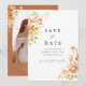 This terracotta floral photo save the date card features warm burnt orange watercolor florals paired with an elegant, modern layout. Designed for couples who want a refined yet romantic announcement, it works beautifully for fall, boho, and neutral-toned weddings.