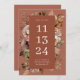 Anuncia tu gran día con esta elegante tarjeta de aviso de fecha de otoño, que presenta flores de acuarela suaves en tonos cálidos de arcilla de rosa terracota, rojo arcilla apagado y madera de rosa especiada. El diseño combina elementos rústicos y románticos, lo que lo hace perfecto para bodas de otoño con temas florales boho, terrenales o modernos. Los delicados toques de color rosa y los acentos neutros cálidos mejoran la paleta estacional, mientras que la disposición minimalista mantiene el enfoque en su fecha especial. Disponible como tarjeta impresa o descarga digital.