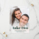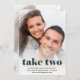 Este moderno, elegante y divertido cambio de fecha en la tarjeta incluye dos fotos de la pareja. En el frente hay un moderno texto esmeralda verde casual que dice "tómate dos", junto con tus nuevos detalles bodas. En la parte de atrás hay una segunda foto descolorida de la pareja. Un boda elegante, sencillo y caprichoso cambia la tarjeta de fecha que resaltará tus fotos personales favoritas.