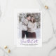 La foto de tu pareja se muestra en esta elegante tarjeta de fecha. Un simple marco blanco le da la importancia que merece. Guardar la fecha está escrito en un texto moderno y de moda. Dos líneas de texto le permiten personalizar su mensaje. El texto de la parte posterior proporciona más información. Diseñado para embellecer fácilmente cualquier fotografía de estilo para cualquier temporada. Muy fácil de personalizar.