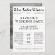 Para tu boda rústica de otoño, este aviso de periódico en fecha de reserva trae vibraciones atemporales con tonos de foto cálidos y dorados, fuentes vintage y tu monograma. Piensa en el aire fresco, las hojas que caen y una forma elegante de decir: “¡Nos casamos!”