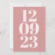 Moderno estilo minimalista para invitar a sus invitados a guardar su fecha boda con este elegante diseño tipográfico, con su fecha en grandes números apilados de arriba a abajo de la página en rosa pálido sobre un fondo blanco y se repiten en el otro lado contra un fondo polvoriento y coordinado de color rosa. En la parte delantera, una pequeña tipografía gris sin sans se coloca encima de cada uno de los números con tus detalles. El texto es fácilmente personalizado, incluyendo los números de fondo que cambiarán simultáneamente en ambos lados. También puede cambiar los colores de texto y fondo para que se adapten mejor a su esquema de color boda si lo desea a través de la opción personalizar. Si necesitas ayuda con esto, por favor envíame un mensaje.