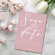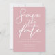 Esta polvorienta boda rosa subió la tarjeta Save the Date presenta una delicada tipografía blanca para una romántica ceremonia vespertina para una novia femenina a la que le gustan los colores suaves y el mínimo diseño de escritura. El rosa pastel suave invita al descanso.
