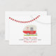 Una boda salva la fecha con un ilustracion de un remolque rojo de inspiración vintage estacionado sobre hierba verde. Trailer tiene una caja de ventanas llena de coloridas margaritas y susanos de ojos negros. Fijación gris y rojo en la parte superior. Busque las invitaciones a la boda coincidentes y más en Jill's Paperie.