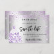 Un fondo moderno de aspecto plateado falso decorado con purpurina falsa morada, destellos y un vestido. Personalice y agregue una fecha y nombres. El texto: Guarden la fecha está escrito con una letra manuscrita de estilo moderno y grande.