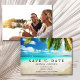Tropical beach scene with palm tree wedding save the dates for your destination beach wedding. This invitation can be used for the location of your choice, simply change the wording on the template to fit your needs. Add your details to the front and photo to the backside of the card.