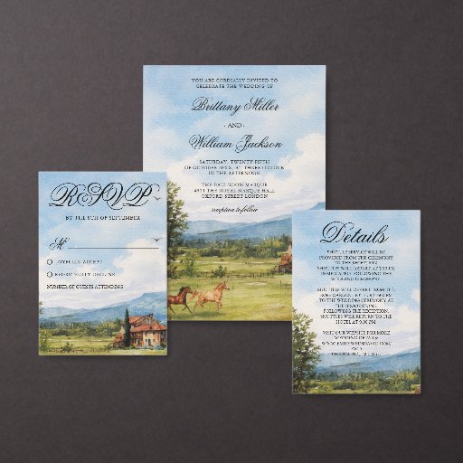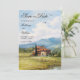 This wedding theme features a hand-painted watercolor countryside scene with sunlit fields, hills and horses. Perfect for destination weddings and vineyard celebrations. A portrait of European countryside landscape. This invitation can be easily edited with your wedding details.