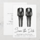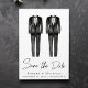 Anuncio de guardar la fecha de boda gay elegante y chic con dos acuarelas de esmoquin y "Guardar la fecha" en una tipografía estilizada. Agrega tus nombres, fecha de la boda y ubicación en tipografía moderna. Personaliza con tus detalles en el reverso.