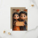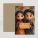 ilustracion personalizado de anime 3D de un niño y chica indio con atuendo tradicional con ojos grandes adorables y pelo negro. El chica lleva un vestido naranja y hay flores de colores en la pared detrás de ellos.
