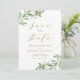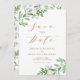 Infórmele a sus huéspedes la fecha de su boda con este personalizable, guarde la tarjeta plana de fecha. Cuenta con un ilustracion acuarela de vegetación y flores blancas con un toque botánico a juego. Personalice agregando nombres, fecha, lugar y otros detalles. Esta vegetación, salvo el anuncio de fecha, es perfecta para bodas de primavera e invierno.