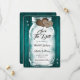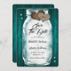 Bodas verde azuladas rusticas salvan la tarjeta de cita con un frasco de albañil con luces de cuerdas y corazones de bupón en un fondo de madera de granero adornado con luces de manga. Personalice fácilmente esta linda boda verde azulada rústica y ahorrando la fecha en línea. Los elementos coincidentes disponibles para complementar esta boda verde azulada ahorran la fecha.