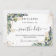Reserva La Fecha Verde de eucalipto para boda dorado blanco follaje