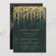 Una ilustración de ramas de árboles con exuberante vegetación silvestre y follaje colgante, superpuesta digitalmente con dorado, sobre un fondo verde esmeralda brillante, adorna esta tarjeta de "save the date" para una boda de primavera verano otoño o invierno con un tema de bosque encantado. Un elegante y moderno "save the date" para una boda de cuento de hadas. Perfecto para novias que aman el entorno de bosque de cuento de hadas, el tema de bosque de hadas o jardín de hadas y el verde esmeralda y dorado.