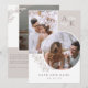 Tarjeta de aviso de save the date a dos caras en blanco y taupe con tus iniciales, fotos superpuestas y vegetación con fuentes limpias y elegantes. Tarjeta de save the date con foto con un diseño moderno personalizado con tu monograma y fotos, dos en un lado y una en el otro.
