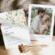 Un refinado diseño de anuncio de boda en verde salvia y blanco con flores de acuarela suaves y una elegante disposición de foto en el reverso.