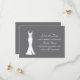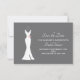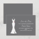 Un conjunto de tarjetas planas para guardar la fecha en un fondo gris con clase. Diseñado con un vestido blanco elegante colgado de una percha. Diseño minimalista simple.