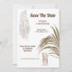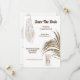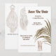 Dos sillas de madera cubiertas con suave chiffon atado en la parte posterior están enmarcadas por una sola hoja de follaje grande. Un bonito atrapasueños blanco con encaje trenzado y largas plumas colgantes aparece en la esquina superior izquierda y las plantillas de texto para los detalles de su próxima boda aparecen entre las ilustraciones elegantes. Un hermoso vestido de novia largo y fluido que cuelga de una percha aparece en la parte posterior. Estas invitaciones minimalistas pero lujosas son ideales para celebraciones de boda con tema de playa, verano, safari africano, jungla, aire libre y bosque.