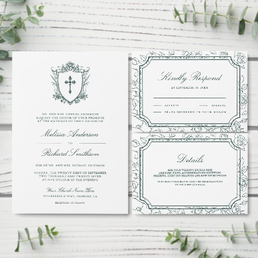 Reserva La Fecha Victorian White and Emerald Green Catholic Wedding