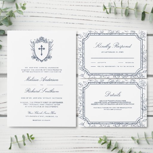 Reserva La Fecha Victorian White and Navy Blue Catholic Wedding