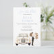 This elegant save-the-date wedding invitation features a timeless design centered around a beautifully illustrated antique wedding car, evoking a sense of vintage romance and charm. Beside it, a bride and groom share a tender kiss, capturing the joy and intimacy of the special moment. The text is presented in a lavender hue, adding warmth and sophistication while standing out gracefully against the background. Thoughtfully designed to be fully customisable, every detail—from names and dates to key information—can be tailored to reflect your unique celebration.