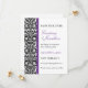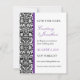 Un patrón de papel pintado damasco en blanco y negro junto con acentos de púrpura real sirven para destacar esta invitación. Fácilmente personalizable con su(s) nombre(s), fecha del evento e información. La parte trasera se deja intencionadamente en blanco. Disponible en colores alternativos con favores, postales e invitaciones a juego