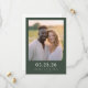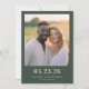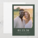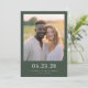 This wedding save-the-date card features a rectangular layout with a solid dark green border framing a heartfelt photograph of two individuals in an outdoor setting, bathed in the warm glow of sunrise or sunset. The color palette is dominated by natural tones, including creamy whites and golden hues, creating a serene and intimate atmosphere. Clean, modern typography highlights the date and names, adding elegance to the design. The overall style is candid and authentic, capturing a moment of joy and celebration, perfect for inviting guests to a special occasion.