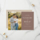 This wedding save the date features a split layout with a warm, golden photograph of a couple standing in a field on one side and elegant text on a maroon background on the other. The color palette includes earthy tones like muted greens, yellows, and neutral grays, creating a rustic yet modern feel. The typography uses classic serif fonts for a formal touch, while the overall design balances natural charm with simplicity, conveying warmth and intimacy perfect for celebrating a special occasion.