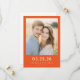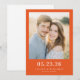 This wedding save the date features a warm and inviting design with a central photograph of two individuals set against an outdoor backdrop, framed by a vibrant orange border. The layout is clean and balanced, emphasizing clarity with ample negative space around the photo. The typography combines bold serif fonts for the date and elegant sans-serif letters for names, creating a modern yet classic aesthetic. The overall mood is one of celebration and intimacy, perfect for announcing your special day.