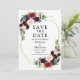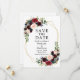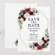 Elegante acuarela Borgoña Floral Save The Date Boda Tarjeta de Invitación incluye rosas de color burdeos, flores azules, rosas rosas rosas, flores rojas y vegetación en un marco geométrico dorado.