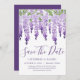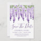 Wisteria de acuarela Save the Date incluye flores de glicinia de color agua elegantes en lavanda suave y morado con hojas verdes sobre un fondo blanco con la información de Save The Date que aparece a continuación. Personalice editando el texto en los cuadros de texto. Diseñado por Evco Studio www.zazzle.com/store/evcostudio
