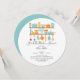 Equipamiento moderno La invitación a la ducha de novias de cocina con herramientas de cocina azul y naranja sobre un fondo blanco contemporáneo con un fondo azul coordinado. Visite nuestra tienda para ver las invitaciones a ducha de cocina a juego.