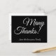 Este respetable y elegante diseño de tarjetas postales de agradecimiento incluye el mensaje "¡Muchas gracias!" en la parte delantera, junto con un mensaje de personalizable en la parte trasera. Se podría usar para mostrar agradecimiento a alguien que ha asistido a un boda, un funeral, una graduación o algún otro evento.