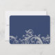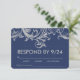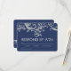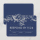 Algo antiguo y algo nuevo... Las tarjetas de respuesta de boda inspiradas en lo antiguo presentan tipografía diferente con un adorno floral gris elaborado en la parte superior sobre un fondo azul oscuro. Los detalles del texto están en gris y son completamente personalizables.