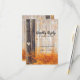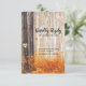 Tarjetas de respuesta de boda de otoño campestre que presentan un bosque otoñal rústico con hojas rojas, naranjas y doradas, árboles de abedul plateados, un corazón tallado de cuento de hadas en el árbol con las iniciales de la novia y el novio, y una elegante plantilla de respuesta de boda editable.