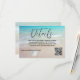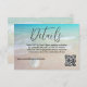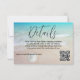Tarjeta de detalles de boda con tema de playa y opción para responder en línea. Letra "detalles" (o RSVP) moderna en la parte superior con un párrafo de texto impreso y espacio para la URL del sitio web según sea necesario. Incluye un código QR para que los invitados accedan fácilmente a una ubicación de respuesta, o puede eliminar la imagen del código en la herramienta de diseño - "personalizar más". El agua azul tropical y la arena de la playa son el fondo con una pequeña concha de dólar blanca.
