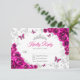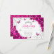 Tarjeta de respuesta RSVP de Quinceañera floral rosa fucsia plateada. Características, letra script, mariposas plateadas, rosas de acuarela y tiara. Perfecta para una celebración glamurosa de estilo princesa elegante. Personalice con sus propios detalles.