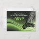 Tarjeta de respuesta de RSVP de boda de motociclista de carretera verde, con una motocicleta en un fondo abstracto degradado verde, blanco y negro y una malla blanca. Diseño elegante y fresco perfecto para los motociclistas con buen gusto. Algunos elementos cortesía de Clipartandfonts.com.