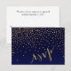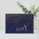 Esta tarjeta de respuesta de RSVP chic presenta motas brillantes de confeti cuadrado dorado que se derraman sobre el cuerpo de esta tarjeta azul marino. Productos coincidentes disponibles. Viene en 6 colores: berenjena, azul marino, turquesa, negro, rosa y arena. Haga clic en el botón PERSONALIZAR para personalizar con su propio texto. PARA VER TODA LA COLECCIÓN, VISITE MI SITIO WEB: glamprettyweddings.com. Para preguntas o solicitudes personalizadas, envíe un correo electrónico a: cheryl@glamprettyweddings.com/contact. Diseño "Diamonds in the Sky" por Cheryl Daniels © 2014.