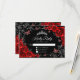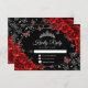 Tarjeta de respuesta Quinceanera RSVP floral de color negro, rojo y plata. Características, letra de guión, mariposas plateadas, rosas de acuarela y tiara. Perfecto para una elegante celebración de glam al estilo de la princesa. Personaliza con tus propios detalles.