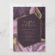 Se obtiene tanto glamour como alto impacto con este conjunto de bodas coordinadores que presenta patrones abstractos de agate, texturados con falsos cristales y resaltados en brillantes Relieves metalizados de oro falso. Combinaciones de colores llamativos, como esta suite con su paleta de lujo, desde uva muda y malva hasta rosa de orquídea suave, crean el fondo para las piezas de esta colección coordinada. Esta elegante invitación a la boda presenta todo lo anterior con un hexágono, etiqueta en uva negra, para sostener su texto. Se proporciona una plantilla para agregar fácilmente los detalles del evento. Vea el vínculo de colección en esta página para ver todos los elementos coincidentes de este hermoso diseño o busque ID827 para ver opciones de color adicionales para este diseño.