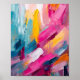 Una llamativa pintura abstracta moderna caracterizada por llamativas y gruesas pinceladas en vivos tonos rosa, azul, naranja y blanco. Las capas texturadas y los trazos de barrido crean una sensación de movimiento y energía, con los colores mezclados y contrastados en una composición dinámica y contemporánea. La interacción de tonos fríos y cálidos añade profundidad, haciendo que esta obra de arte sea llamativa y expresiva.